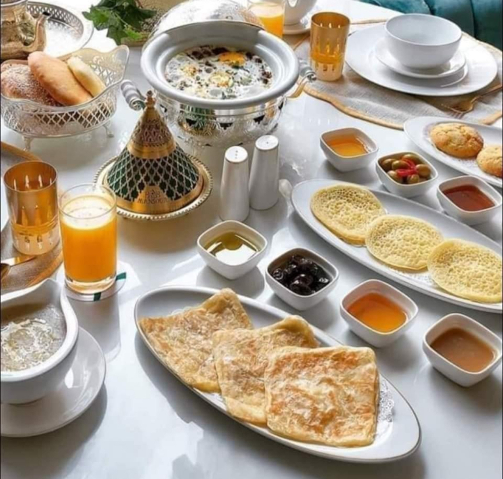 Composés de crêpes marocaines, pains marocains, beurre, confitures, miel, œufs, thé à la menthe, café et eau.